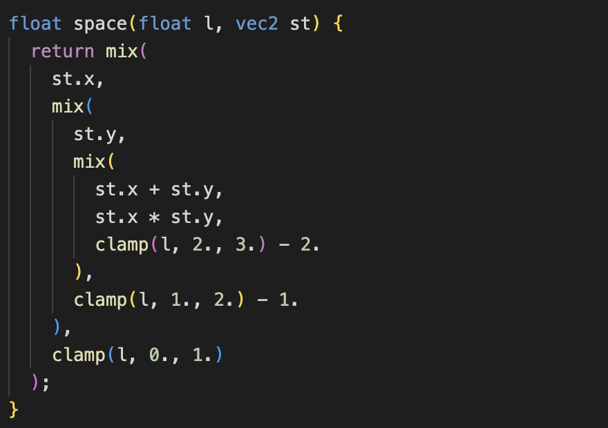 This function returns an interpolated value between different altered spaces. It’s ugly but it does its job.